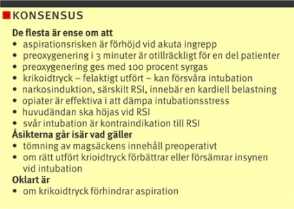 Handlingsberedskap om patienten kräks är essentiell vid RSI. Det är viktigt att det i den akuta situationen inte uppstår förvirring om huruvida patienten ska läggas i vänster- eller högersidigt dränageläge. En fördel med att välja vänster sidoläge är att intubation då underlättas av att den rörelse som ska föra tungan åt vänster får hjälp av tyngdlagen [11]. Aikenhead och medarbetare framhåller möjligheten att redan vid inledningen av anestesin sänka huvudändan för att undvika aspiration av regurgiterande maginnehåll [2].