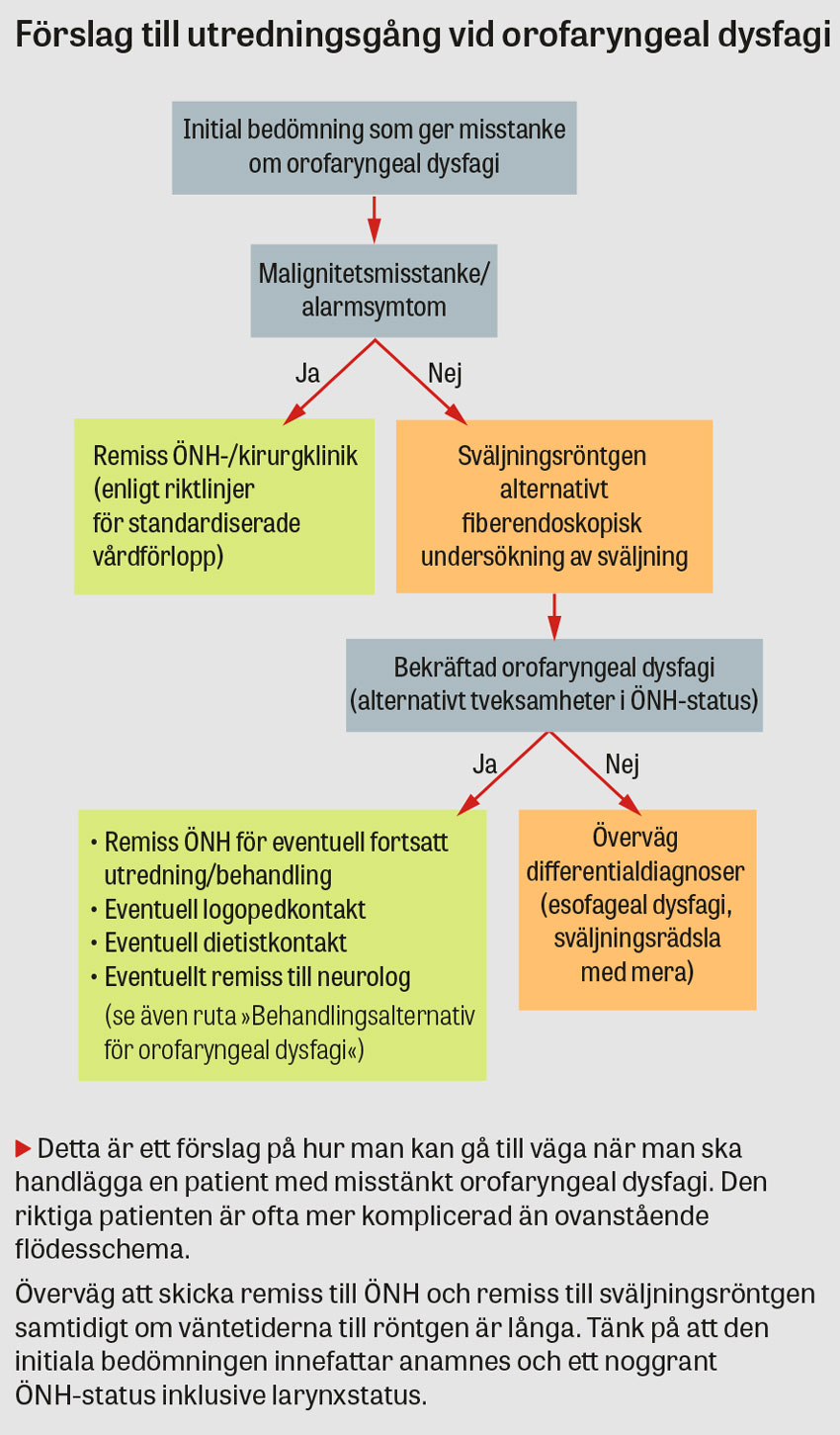 Alarmsymtom. Om ÖNH- eller esofagusmalignitet misstänks ska riktlinjer enligt standardiserat vårdförlopp följas [6, 7]. Malignitet i ÖNH-området kan ge dysfagi genom obstruktion, nervpåverkan [15] eller smärta. Tecken på aspiration måste också ses som akuta på grund av risken för allvarliga följder.