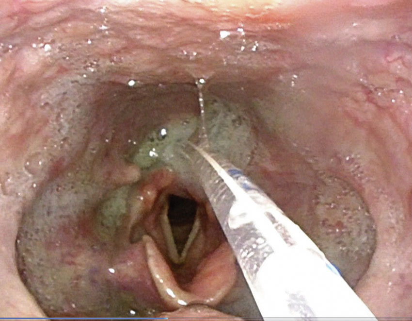 Bild från fiberendoskopisk undersökning av sväljning. Patienten får svälja dryck och mat som ofta är färgad med karamellfärg, i detta fall grönt. Sväljningen filmas med flexibel optik genom näsan. Bilden visar en patient med sond ner i esofagus som just svalt en tesked kolsyrat vatten. Man ser retention (kvarvarande grönt) i svalget, men ingen penetration eller aspiration.