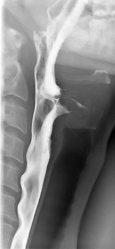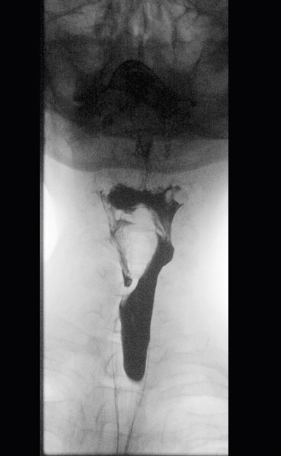 Bild från sväljningsröntgen i frontalprojektion. Bilden visar en patient med pares av vänster sidas farynxkonstriktorer. Kontrasten sväljs ner på vänster sida.