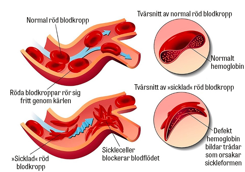 Sicklecellsjukdom är en allvarlig genetisk sjukdom som kännetecknas av att kroppen producerar defekt hemoglobin (HbS). Under syrefattiga förhållanden polymeriseras HbS till långa och stela kedjor i de röda blodkropparna, som blir halvmåne- eller »sickle«-formade. Jämfört med friska röda blodkroppar är de sickleformade cellerna hårdare och böjs inte lika lätt, vilket leder till hemolys, endotelskador och kärlocklusioner med multipla komplikationer som följd.