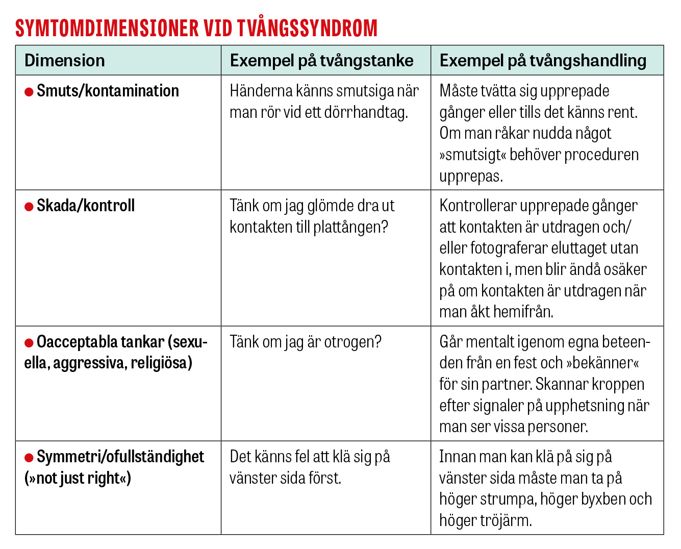 Tvångstankar och tvångshandlingar faller ofta inom fyra dimensioner: rädsla för smuts, smitta eller kontamination, rädsla för att orsaka skada (till exempel brand, vattenskada, olycka), oacceptabla tabutankar relaterade till religion, aggressivitet eller sexualitet samt behov av symmetri eller upplevelse av ofullständighet [9].