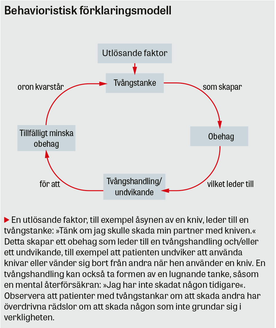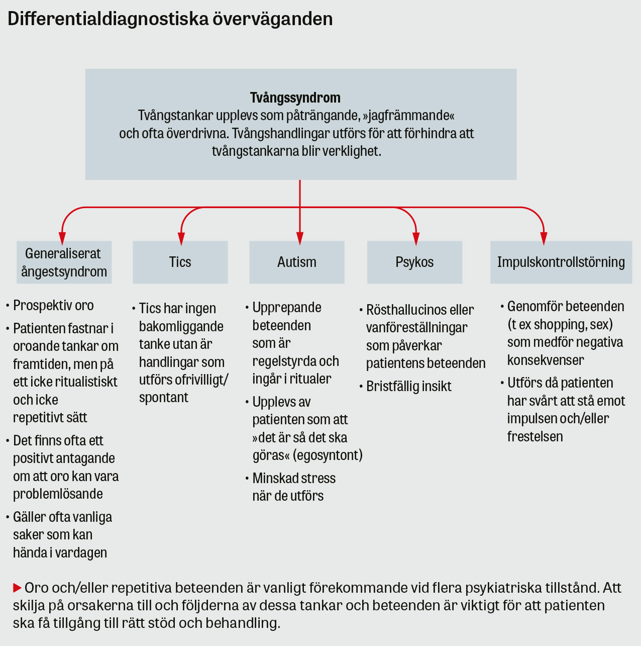 Som ett led i diagnostiken bör somatisk och psykisk samsjuklighet utredas. Strukturerad psykiatrisk intervju, till exempel MINI (Mini international neuropsychiatric interview) eller SCID-I (Structured clinical interview for DSM-IV-axis I disorders) kan användas som en del av bedömningen och vägleda den psykiatriska differentialdiagnostiken. I figuren på nästa sida visas vanliga differentialdiagnoser och hur de särskiljs från tvångssyndrom. Tvångssyndrom är också vanligt förekommande i kombination med andra psykiatriska tillstånd, framför allt depression, ångestsyndrom, autism, tics och substansbrukssyndrom [3, 4]. Misstanke om autism i denna patientgrupp bör föranleda neuropsykiatrisk utredning.
