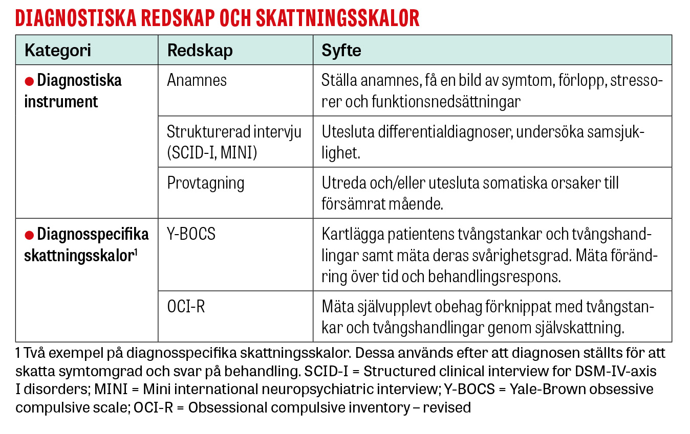 MINI och SCID-I innehåller screeningfrågor om tvångssyndrom, vilket är användbart då tvångssyndrom kan vara förknippat med skam och därför inte nödvändigtvis framkommer i en allmän anamnes. Ett typiskt kroniskt förlopp och en tidig debut stärker diagnosmisstanken. Den vanligaste åldern för diagnos är 10–20 år, men tillståndet kan debutera i alla åldrar [13]. Laboratorieblodprov rekommenderas för att utesluta tillstånd som kan bidra till försämrat psykiskt mående. Tvångssyndrom kan leda till isolering i hemmet eller enformig kost, varför nutritionsproblem och vitaminbrist bör uteslutas.