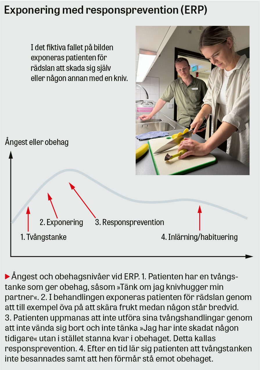 Förstahandsvalet för behandling av tvångssyndrom är en form av kognitiv beteendeterapi (KBT) som kallas exponering med responsprevention (ERP) [14]. Studier visar att ERP har bättre långtidseffekt än läkemedel vid behandling av tvångssyndrom [15, 16]. Cirka två tredjedelar av patienterna som genomgår ERP svarar bra på behandling [17]. Under behandlingen utsätter sig patienten för situationer som framkallar tvångstankar (exponering) och tränar på att avstå från att utföra tvångshandlingar (responsprevention). Det är viktigt att patienten avstår alla tvångshandlingar – såväl synliga tvångshandlingar som dolda mentala tvångshandlingar, till exempel ramsor, räknande eller neutraliserande tankar.