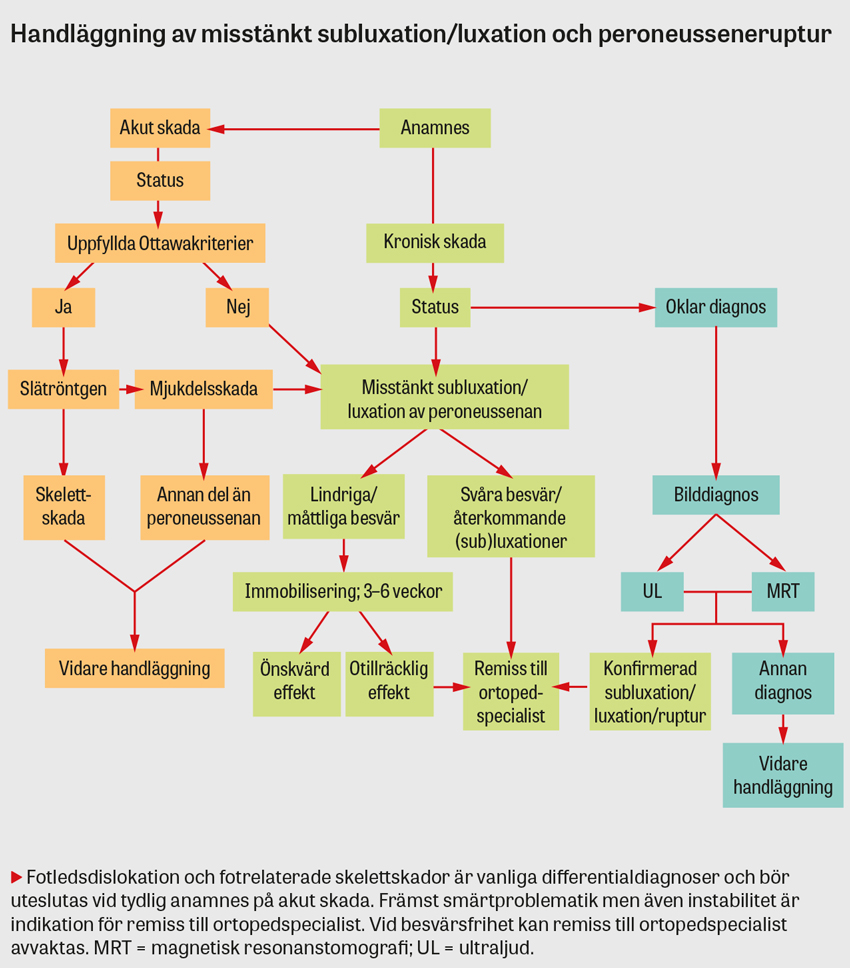 Peroneusseneruptur bör differentieras från fotledsdistorsion, avulsionsfraktur på basen av femte metatarsalbenet och fraktur av os peroneum [49].