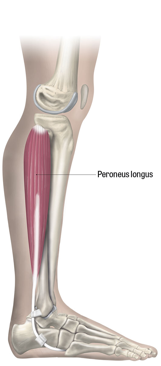 Peroneus longus. Peroneusmuskulaturen utgörs av peroneus brevis, peroneus longus och peroneus tertius. På bilden kan noteras peroneusmusklerna av betydelse för diagnostisering av peroneusseneruptur.