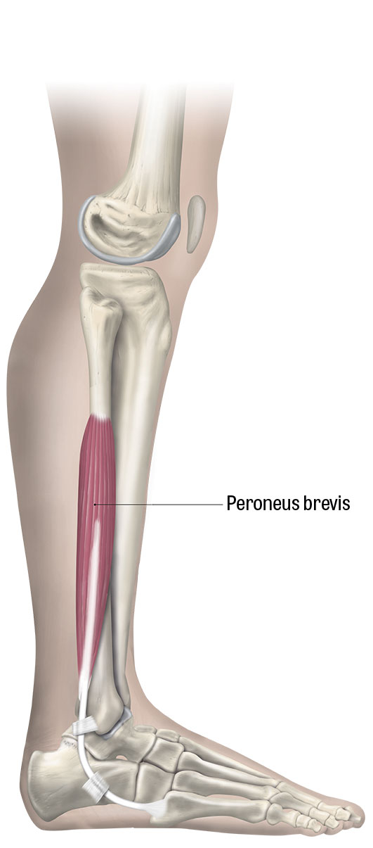 Peroneus brevis. Peroneusmuskulaturen utgörs av peroneus brevis, peroneus longus och peroneus tertius. På bilden kan noteras peroneusmusklerna av betydelse för diagnostisering av peroneusseneruptur.