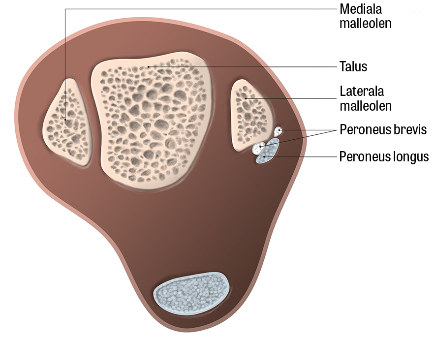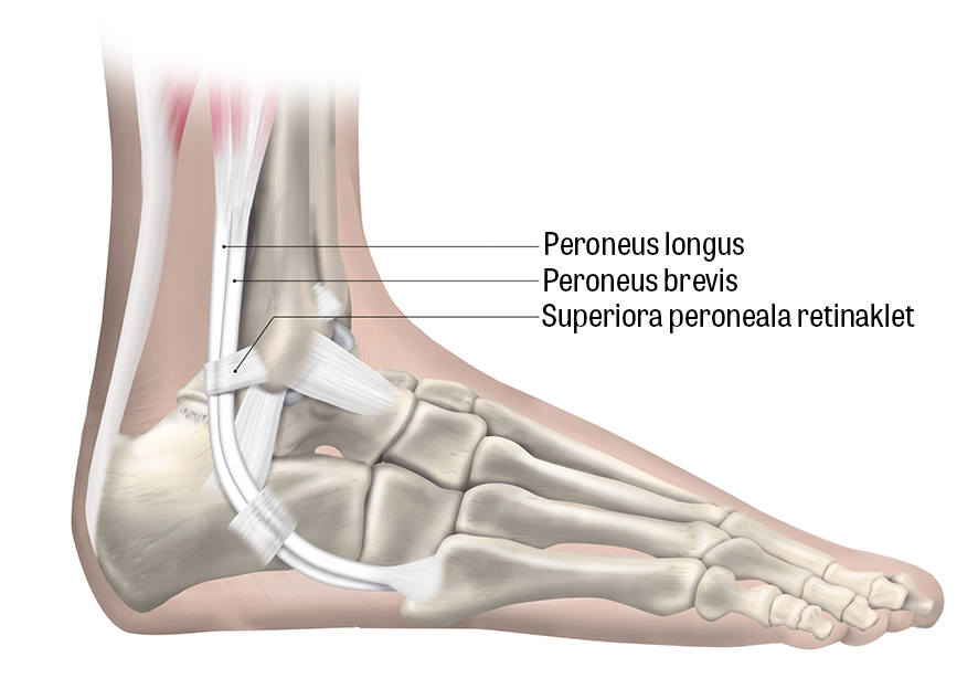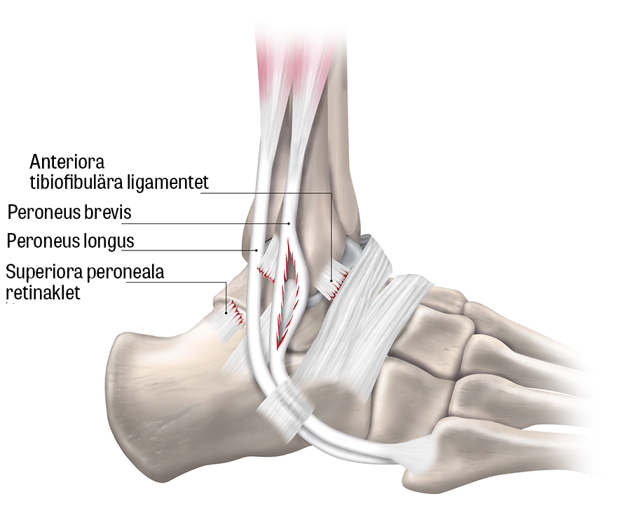 Peroneussenorna löper i en skåra på baksidan av laterala malleolen där en tunnel skapas av superiora peroneala retinaklet (SPR), posteriora talofibulära och kalkaneofibulära ligamenten. Skårans form har betydelse för senornas stabilitet, och SPR är en viktig struktur för att förhindra subluxation av peroneussenorna [39]. Kronisk ruptur orsakas av degeneration av peroneussenorna ofta efter upprepade distorsioner till följd av dysfunktion eller skada av SPR [42]. Akut skada förekommer efter supinationsvåld, vanligen i samband med sportaktivitet [43]. Bland predisponerande faktorer kan nämnas ytlig skåra i fibula, varusdeformitet av foten och laxitet av fotledens laterala ligament [40, 44].