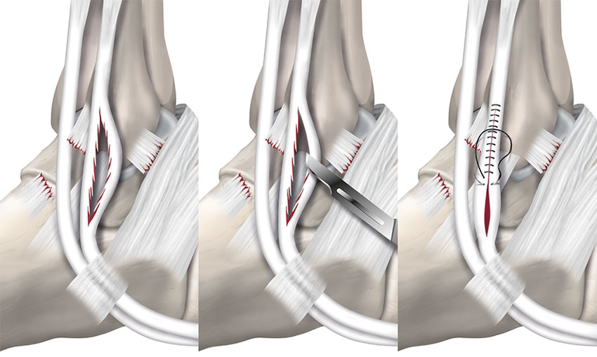 Rekonstruktion av skadad peroneus brevis-sena. Det är viktigt att avlägsna den trasiga/degenererade vävnaden i senan, innan den sys ihop. Efter rekonstruktion av senan är stabilisering av fotleden aktuell med rekonstruktion av de laterala ligamenten.
