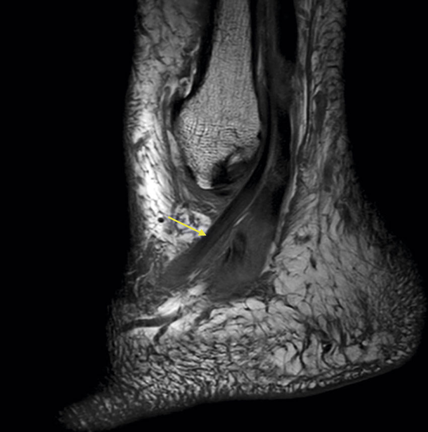 Magnetisk resonanstomografibild av patient med vänstersidig partiell ruptur av peroneus brevis-senan i sagittalplanet (gul pil).