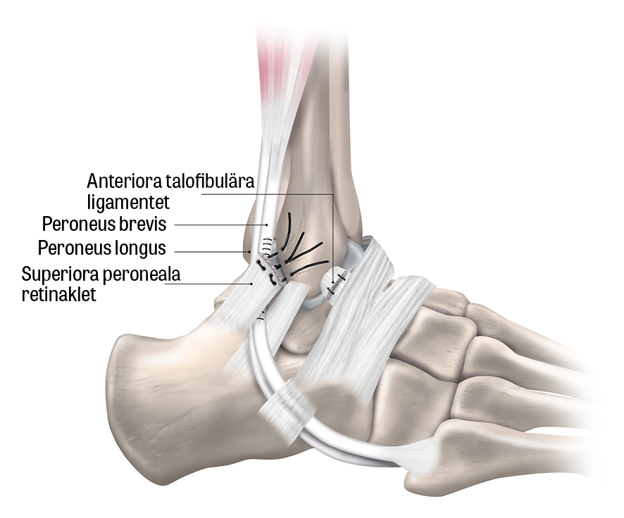 Rekonstruktion av SPR (Superiora peroneala retinaklet) och anteriora talofibulära ligamentet efter att skadan i peroneus brevis-senan först har åtgärdats.