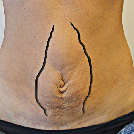 Figur 1. Rektusdiastas omfattande både övre och nedre medellinje.