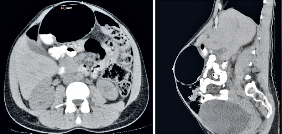 Figur 2. Rektusdiastas och uttänjd rektusmuskulatur under krystning (datortomografi), bilden till höger från sidan.