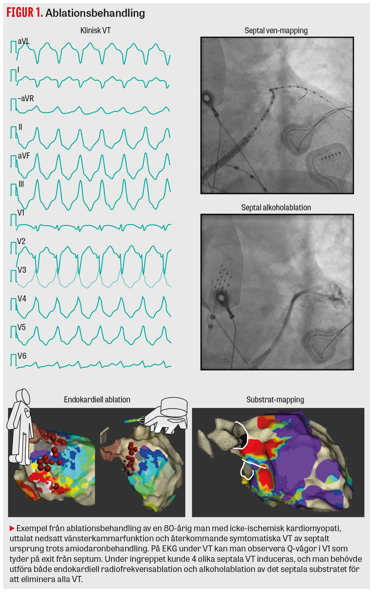 Behandlingen utförs med en ablationskateter som avger värmeenergi (radiofrekvensablation) från sin spets mot de områden som misstänks orsaka VT. I vissa fall ligger substratet djupt intramuralt, ofta i septum, och kan då vara mycket svårt att nå med radiofrekvensablation. I dessa fall har man på några centrum börjat med mapping av det septala vensystemet och även behandling med lokal alkoholinstillation (Figur 1) [15]. Det finns även möjlighet att utföra så kallad septal bipolärablation med två ablationskatetrar från höger och vänster kammarseptum samtidigt [16]. En ny energiform, pulsfältablation (Pulsed field ablation), PFA, används sedan några år tillbaka vid flimmerablation och kan komma att utgöra ett effektivt behandlingsalternativ vid VT-ablation i framtiden.