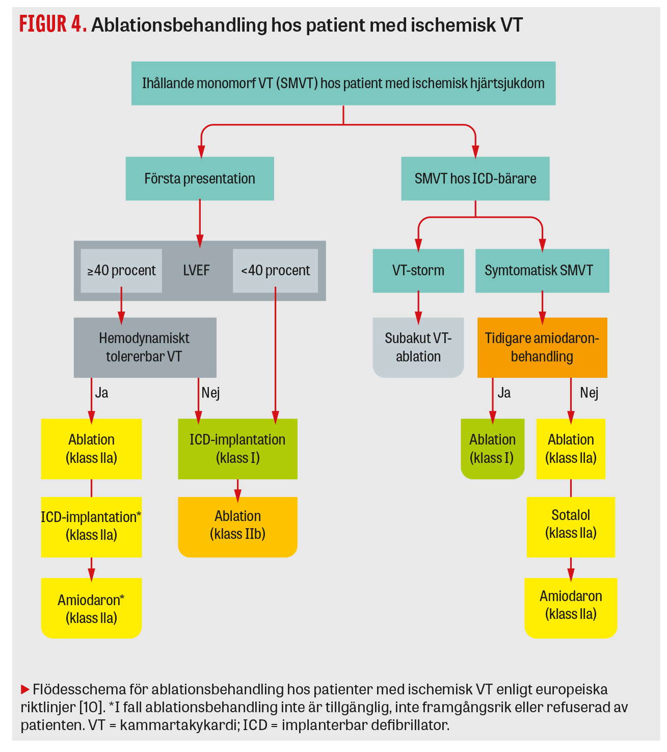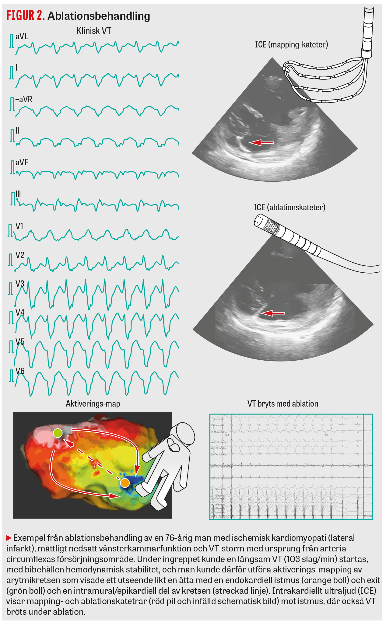 En tredje studie (Vanish) på patienter som utvecklade VT trots pågående antiarytmisk läkemedelsbehandling visade att VT-ablation minskade risken för död, ICD-chock och VT-storm jämfört med utökad antiarytmikabehandling [9]. De senaste europeiska riktlinjerna har därför förstärkt indikationen för ablationsbehandling hos patienter med ischemisk hjärtsjukdom: a) ablation jämställs med amiodaron för ICD-patienter med symtomatisk VT och rekommenderas i första hand när amiodaron inte har effekt; b) ablation kan utföras utan ICD-implantation hos patienter med hemodynamiskt stabil VT och LVEF (ejektionsfraktion från vänsterkammaren) >40 procent (Figur 4). För icke-ischemisk VT finns fortfarande inga specifika randomiserade studier, men observationella data pekar på en sämre lyckandefrekvens än vid ischemisk VT, varför ablation rekommenderas först efter amiodaronbehandling (indikation IIa). Anledningen till lägre lyckandefrekvens hos dessa patienter är att arytmisubstratet ofta är beläget i mitten (intramuralt) eller på utsidan (epikardiellt) av hjärtmuskeln, och således mer svåråtkomligt än vid ischemisk hjärtsjukdom, då det oftare är lokaliserat i hjärtmuskelns insida (endokardiellt).