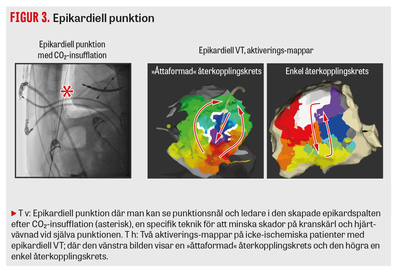 Åtkomst via femoralvenen är standard, och man når vänster kammare genom punktion av förmaksseptum. Arteriell åtkomst kan behövas för att nå vänster kammare via aorta och kan underlätta åtkomsten av vissa områden i kammaren, till exempel runt aorta och mitralisklaffarna (Figur 1) och den anterolaterala papillarmuskeln. Vid misstanke om substrat som kräver epikardiell ablation görs en perikardpunktion direkt vid ingreppets start. Vi har nyligen börjat att insufflera koldioxid i perikardiet för att minska komplikationsrisken vid själva perikardpunktionen (Figur 3).