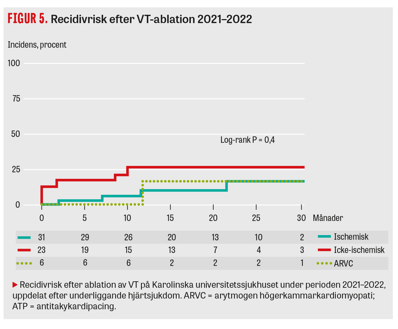 Under 10-årsperioden från 2013 till 2022 genomfördes totalt 1 714 ablationer för VT i Sverige, varav 440 (26 procent) på Karolinska universitetssjukhuset (data från Svenska kateterablationsregistret). Förvånande nog har antalet VT-ablationer per år endast ökat marginellt över tid och ligger i Sverige med 1,7 ingrepp per 100 000 invånare/år (2022) lägre än i Danmark (2,3/100 000) [18] och mycket lägre än i Tyskland (cirka 9,1/100 000 år 2020) [19]. Under det senaste decenniet har det skett en omfattande utveckling av teknisk utrustning och operationsmetoder. För att få en bild av metodens aktuella effektivitet och säkerhet sammanställde vi resultat av VT-ablationer utförda hos oss under 2021 och 2022. Det gjordes 68 VT-ablationer på 60 patienter med strukturell hjärtsjukdom under denna tidsperiod. Medianåldern var 69 år, majoriteten var män med ischemisk hjärtsjukdom och den övervägande delen av patienterna genomgick ett subakut ablationsingrepp på grund av VT-storm (Tabell 1). Ingreppen var relativt långvariga (genomsnitt 233 minuter), och speciella tekniker som epikardiell access, Ecmo och alkoholinstillation användes i 27 procent av fallen. Vid en uppföljningstid på 20 (9–33) månader hade 11 (18 procent) patienter fått recidiv i form av ICD-behandling eller dokumenterad VT (Figur 5). För denna utfallsanalys har man tillåtit ett andra ablationsförsök inom 6 månader vid VT-recidiv, vilket utfördes på 8 patienter, varav 4 ånyo fick recidiv.