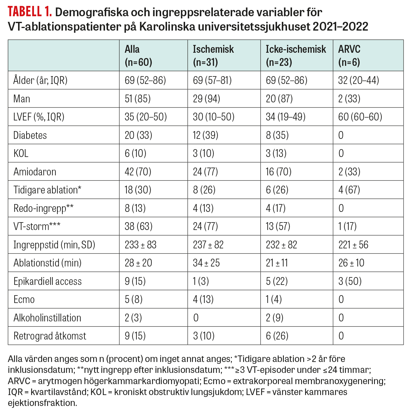 Sammanfattningsvis är recidivrisken och komplikationsrisken relativt låg jämfört med liknande registerstudier från utländska centrum. Noterbart är den relativt höga andelen subakuta ablationer som utfördes på grund av VT-storm (63 procent), något som rapporterats betydligt lägre i utländska registerstudier (15–34 procent) [6, 12]. Man kan spekulera om huruvida våra VT-patienter i mindre utsträckning genomgick ablation i ett tidigt skede av sjukdomsförloppet, vilket leder till att majoriteten får behandlas subakut i stället. Denna behandlingsstrategi är problematisk då patienten oftare befinner sig i ett instabilt hemodynamiskt läge med behov av cirkulatoriskt stöd och risk för dekompensation av andra organsystem. Det är således inte förvånande att studier har visat på högre ingreppsrisk vid subakut VT-ablation av VT-storm [6]. Tidig identifiering av VT-patienter lämpliga för ablationsåtgärd samt en effektiv struktur av vårdförloppet vid ablationscentrumet bör förbättra denna situation och öka andelen elektiva VT-ablationer. Slutligen kan vår låga ingreppsrelaterade mortalitet (0 procent) spegla att en del av de allra svårast sjuka patienterna inte blir erbjudna VT-ablation, även om patientgruppen vi analyserat är relativt liten och detta således endast utgör spekulationer.