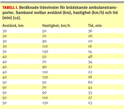 I ambulansförarutbildningen vid Södra Älvsborgs sjukhus och ambulanssjukvården i Dalarna används en sammanställning som på ett tydligt vis åskådliggör sambandet mellan avstånd, hastighet och tid (Tabell 1). Om en ambulans har totalt 30 km att köra från en trafikskadeplats till mottagande sjukhus och ambulansen har en medelhastighet på 90 km/h tar ambulansfärden 20 minuter. Om föraren ökar medelhastigheten till 120 km/h tar samma resa 15 minuter. Den totala tidsvinsten för denna hastighetsökning av ambulansfordonet är 5 minuter.