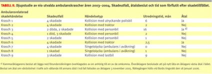En djupstudie av dessa krascher företogs med hjälp av trafikutredningar, trafikmålsanteckningar och i förekommande fall stämningsansökningar. Resultatet presenteras i Tabell II. I de nio ambulanskrascherna dödades tre personer, medan totalt 27 skadades. De flesta polisutredningarna lades ned i brist på bevis relativt kort tid efter skadehändelsen. Endast tre åtalsbeslut fattades. Djupstudien visar att det finns rikliga erfarenheter hos ambulanspersonal av moment vid kraschtillfällena där ambulansfordonet utsatts för rotation och voltning i samband med kraschögonblicket , s k roll over-olycka (rollover accident).