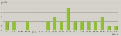 I studien inkluderades 31 fall; 10 kvinnor och 21 män. 13 procent (4/31) var barn (0–14 år) och 87 procent (27/31) vuxna. Den ålderspecificerade incidensen under de första 12 åren i Hib-vaccinationseran ses i Tabell II. Åldersfördelningen av samtliga patienter i studien visas i Figur 1. De fyra barn som insjuknade under studietiden gjorde det mellan 1993 och 1995. Dessa barn var inte Hib-vaccinerade. Från och med 1996 fanns inget fall av epiglottit hos barn (0–14 år).