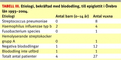 Patienter som hade haft svårigheter att svälja eller andas i 4 dagar, feber >37,9°C och tecken på inflammation av epiglottis, verifierat med direkt eller indirekt laryngoskopi, inkluderades i studien. Patienter exkluderades om de hade en inflammatorisk reaktion i epiglottis som bedömdes vara del i en annan sjukdom, tex infektion utgången från tonsiller. Dessa kriterier var desamma som i den tidigare studien av samma population före allmän Hib-vaccination [4]. Sammanlagt fanns det under tidsperioden 46 patienter med diagnosen akut epiglottit (J05.1). Femton av dessa exkluderades då de inte uppfyllde inklusionskriterierna. Exkluderingsorsaken var i tretton fall att de inte uppfyllde temperaturkriteriet >37,9°C. En patient exkluderades då hon hade en samtidig svalgabscess utgången från ena tonsillen, samt en annan man exkluderades då han insjuknade mer än fyra dagar före inkomsten. Statistisk information avseende demografi i Örebro län hämtades från Statistiska centralbyrån [7].
