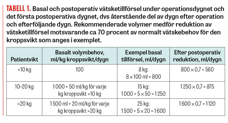 Nyligen publicerade den europeiska barnanestesiföreningen ett konsensusdokument rörande peroperativ vätsketillförsel till barn. Detta dokument anger att den peroperativa vätsketillförseln bör bestå av isoton elektrolytlösning (natrium 140 mmol/l) med glukostillsats 10 mg/ml (1 procent) [18]. För den postoperativa perioden finns i konsensusuttalandet inga riktlinjer utöver dagliga kontroller av S-natriumvärdet så länge patienten försörjs parenteralt.