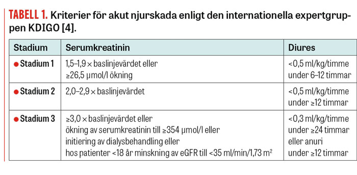 Under flera år användes RIFLE och AKIN parallellt varför KDIGO (Kidney disease: improving global outcomes), en internationell grupp av experter, slog ihop de två till ett enhetligt klassificeringssystem 2013 (Tabell 1) [4]. Enligt KDIGO ska ökningen av serumkreatinin på minst 26 μmol/l ske inom 48 timmar eller så ska ökningen på >1,5 gånger baslinjevärdet ske inom 7 dagar efter njurskadan.