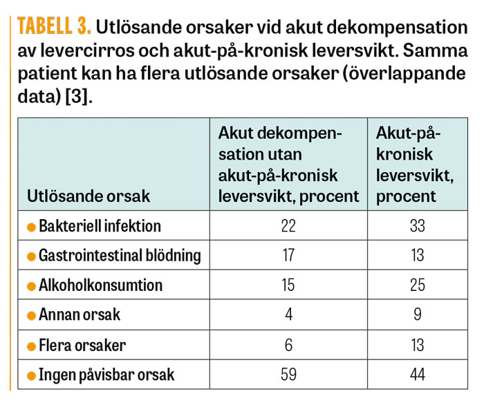 Akut-på-kronisk leversvikt är alltså inte ett tillstånd endast vid terminal leversvikt, utan kan inträffa tidigt i förloppet, t ex hos patienter med kronisk leversjukdom utan cirros eller hos patienter med kompenserad cirros [2]. I CANONIC-studien var förloppet vid akut-på-kronisk leversvikt till och med svårare hos patienter som insjuknade med dekompensation för första gången än hos dem som tidigare hade haft någon episod av akut dekompensation [3]. Utlösande faktorer sågs hos 56 procent av patienterna med akut-på-kronisk leversvikt, medan man inte kunde påvisa någon bakomliggande orsak hos 44 procent. De vanligaste utlösande faktorerna enligt CANONIC-studien redovisas i Tabell 3.