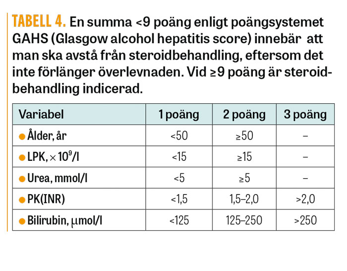 Alkoholhepatit kan betraktas som ett specialfall av akut-på-kronisk leversvikt. Vid misstanke om akut alkoholhepatit (Fakta 1) görs diagnostisk bedömning med poängsystemen GAHS (Glasgow alcoholic hepatitis scale) [6], MELD (Model of end-stage liver disease) eller ABIC (Age, bilirubin, INR and creatinine) [7] för beslut om eventuell behandling med kortikosteroider. Dessa poängsystem hittas på kalkylatorer på internet (t ex http://potts-uk.com/livercalculator.html). GAHS kan även räknas ut manuellt (Tabell 4), där ett värde ≥9 indikerar att behandling med kortikosteroider kan inledas.