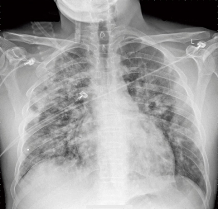 Blodtrycket var 120/75 mm Hg, pulsen 100 slag/minut och saturationen var 81 procent med oxygenmask med flöde 9 l/minut. Auskultation av lungorna avslöjade krepitationer bilateralt. Toraxröntgen på akutmottagningen visade infiltrat bilateralt, vilket tolkades som lungstas (Figur 1). EKG visade sinusrytm, i övrigt inga tecken på akut patologi. Akut ekokardiografi visade helt normala fynd och gav ingen misstanke om kardiellt betingat lungödem.