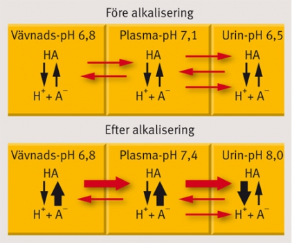 Identifiering av patienter i riskgruppen, snabb diagnostisering och korrekt behandling är viktigt för minskning av morbiditet och mortalitet [7, 8]. Generellt består behandlingen i att hindra ytterligare absorption och att öka utsöndringen av redan absorberat salicylat. Dessutom kan det behövas ytterligare behandling av eventuella komplikationer. Fortsatt absorption av intaget salicylat kan hindras med ventrikelsköljning och tillförsel av aktivt kol. Upprepad tillförsel av aktivt kol har visat sig effektiv för eliminering av redan absorberat salicylat och rekommenderas därför [9]. Genom alkaliserad diures ökas utsöndringen dramatiskt [8, 9] (Figur 2). Framkallande av diures genom riklig vätsketillförsel bör göras under noggrann observation, eftersom det i vissa fall kan förvärra lungödemet [8].
