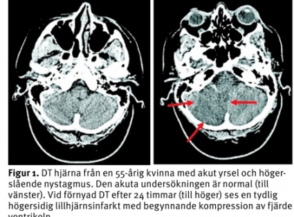 Ett fall som kunde slutat illa: En 55-årig kvinna söker akutmottagningen då hon under dagen blivit akut yr. Hon har sedan tidigare migrän och kostbehandlad diabetes mellitus. För sju år sedan hade hon vestibularisneurit och för fem år sedan en lindrig stroke. De senaste två veckorna har hon upplevt högersidig tinnitus och av och till ostadighet. Hon undersöks av jourhavande neurolog, som finner en svag högerslående spontannystagmus, som ökar vid blickriktning åt höger. Rutinnervstatus är i övrigt invändningsfritt. DT hjärna utan kontrastförstärkning är normal. Patienten remitteras till öron-, näs- och halskliniken och läggs in under diagnosen vestibularisneurit. Nästa dag är hennes symtom oförändrade, förutom att huvudvärk tillkommit. Vid den kliniska undersökningen finner man en högerslående nystagmus som förstärks vid blickriktning åt höger men som inte ökar vid undersökning i Frenzelglasögon. Ögonens följerörelser är sacka-derade vid rörelser åt höger. Det vestibulära impulstestet är normalt, och detta fynd gör att man misstänker central yrsel och beslutar om förnyad neuroradiologisk undersökning. Eftersom det är helg kan man inte få MR akut utan en ny DT hjärna görs, som nu visar en högersidig cerebellär infarkt med svullnad och begynnande kompression av fjärde ventrikeln (Figur 1). Patienten överförs till neurologavdelning för noggrann övervakning och tillfrisknar utan resttillstånd.
