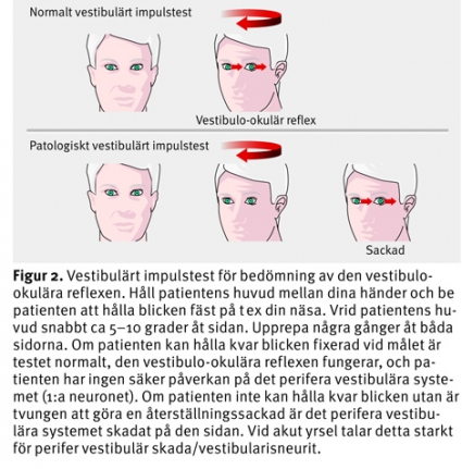 Det viktigaste kliniska testet för att påvisa en uttalad perifer vestibulär skada är det vestibulära impulstestet (head im-pulse test eller head thrust test) [9]. Till skillnad från de flesta kliniska test är detta bara 20 år gammalt och därför ännu inte allmänt känt. Testet utnyttjar det faktum att den vestibulo-okulära reflexens främsta uppgift är att underlätta ett skarpt seende när vi går eller springer genom att stabilisera ögonens position vid huvudrörelser. Innerörats båggångsorgan känner av huvudets rörelse, och med ca 10 ms latens rör sig ögonen åt motsatt håll. Vid en skada i reflexens första neuron, från innerörat via balansnerven till vestibulariskärnorna i hjärnstammen, kommer inte ögonen att röra sig utan i stället följa med huvudets rörelse. Patienten upptäcker att han eller hon inte tittar på målet och kommer efter ca 100–200 ms att göra en liten återställningssackad som undersökaren kan upptäcka som ett patologiskt vestibulärt impulstest (Figur 2).