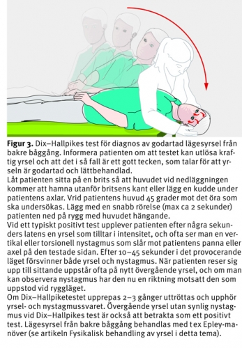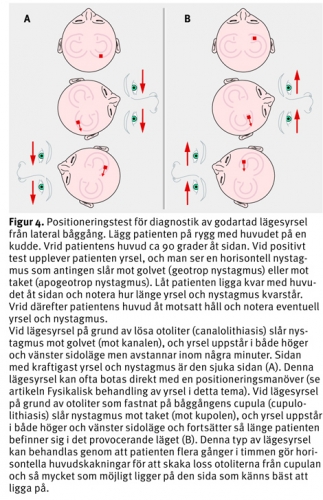 I samtliga kliniska sammanställningar, vare sig det rör sig om allmänna akutmottagningar eller specialiserade yrselmottagningar, är godartad lägesyrsel (»kristallsjuka«) den vanligaste diagnosen [14]. Sannolikt beror detta på att tillståndet, till skillnad från många andra yrselsjukdomar, så strikt och enkelt kan diagnostiseras med olika positioneringstest. Patienter med lägesyrsel insjuknar ofta nattetid eller på morgonen när de vänder sig i eller stiger upp ur sängen. Godartad lägesyrsel från bakre båggången ger oftast lite lindrigare symtom, och när patienten väl kommit upp ur sängen utlöses yrseln bara när han eller hon böjer sig bakåt eller framåt [14]. Lägesyrsel från den laterala båggången ger ofta mer intensiva symtom och är därför vanlig på akutmottagningar. Patienten blir kraftigt yr i både höger och vänster sidoläge. Om patienten ligger absolut stilla försvinner yrseln för att återkomma vid minsta huvudrörelse [15]. Denna typ av yrsel kan förväxlas med vestibularisneurit, och patienten kommer ofta med ambulans (»bakre båggång går, lateral båggång kommer på bår«). Lägesyrseldiagnostiken sker med hjälp av olika positioneringstest (Figur 3 och 4). Patienten kan ofta utan risker botas på några minuter med någon av de olika manövrar [14-16] som utarbetats. Hur man utför manövrarna beskrivs närmare i artikeln Fysikalisk behandling av yrsel i detta tema.