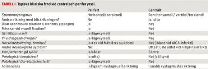 I Tabell I presenteras typiska kliniska skillnader mellan perifer och central yrsel. Om den kliniska undersökningen är helt normal och patienten ändå upplever stort obehag bör patientens psykiska status bedömas. Hospital anxiety and depression scale (HADS) är ett enkelt och väl validerat frågeformulär för bedömning av en patients ångest- och depressionsnivå [13]. Det tar endast några minuter att fylla i och bedöma och kan ge indikation på om en patients yrsel är del i t ex en ångestsjukdom.