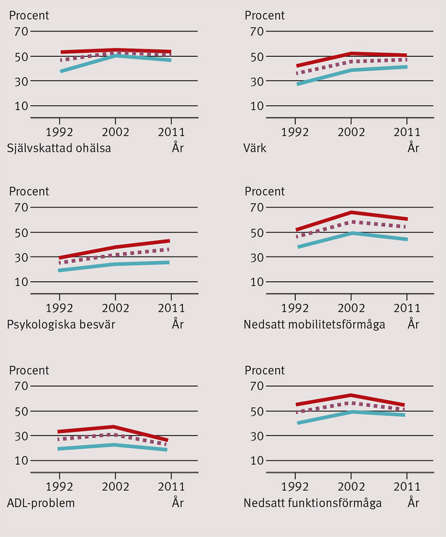 Våra resultat från undersökningen om äldres (77 år och äldre) levnadsvillkor (SWEOLD) visade däremot nästan genomgående på hälsoförsämringar under perioden 1992–2002 [12, 13]. Hälsoförsämringarna var tydliga både vad gäller självrapporterade sjukdomar, besvär och test av funktionsförmåga. Andelen som rapporterade problem med att klara grundläggande vardagliga aktiviteter (ADL) förändrades däremot inte under perioden.