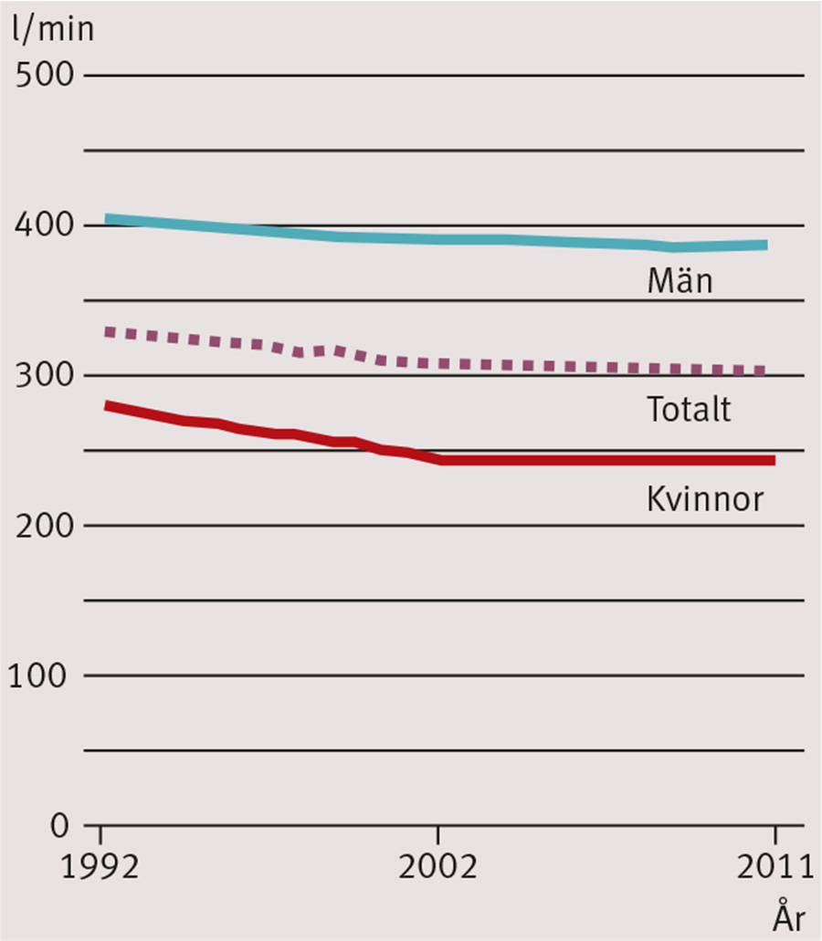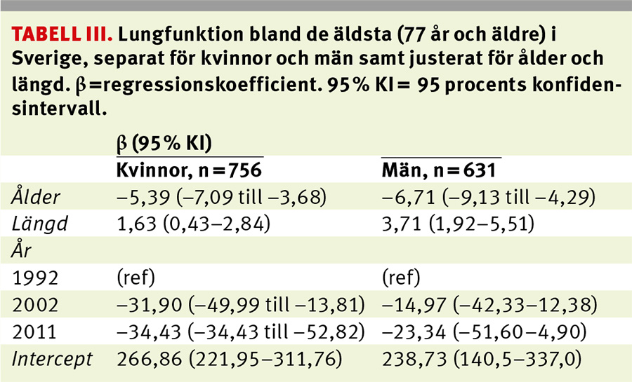 Tabell III visar att den genomsnittliga lungfunktionen försämrades bland kvinnorna under perioden, även då vi kontrollerade för ålder och kroppslängd. Försämringen skedde primärt under perioden 1992–2002, men höll sedan i sig och återfanns även 2011. För männen skedde dock inga signifikanta förändringar när det gäller lungfunktion under hela perioden.