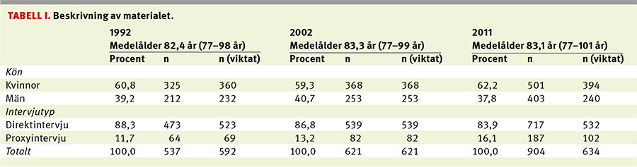 Skillnaderna i urvalskriterier påverkar jämförbarheten mellan de olika undersökningsomgångarna. I studien av hälsoutvecklingen 1992–2002 hanterades detta genom att de deltagare från det senare undersökningstillfället som inte uppfyllde de ursprungliga kriterierna exkluderades [12]. I föreliggande studie baseras estimaten i stället på samtliga svarande. Överurvalet i 2011 års undersökning, samt en viss underrepresentation av 77-åringar i 1992 års undersökning, har justerats med vikter.