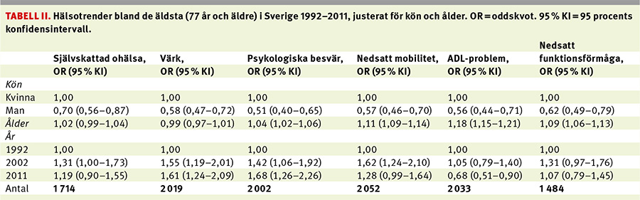 Tabell II visar att hälsan försämrades i termer av global självskattad ohälsa, värk, psykologiska besvär och nedsatt mobilitet under perioden 1992–2002, även då hänsyn tagits till förändringar i köns- och åldersfördelningen. För värk och psykologiska besvär återfanns de höjda prevalenserna av ohälsa även 2011, medan resultaten från 2011 för global självskattad ohälsa och nedsatt mobilitet inte längre skiljde sig signifikant från 1992 års resultat. När det gällde förekomsten av nedsatt ADL-förmåga skedde inga signifikanta förändringar under perioden 1992–2002. Under perioden 2002–2011 minskade däremot förekomsten av nedsatt ADL-förmåga signifikant. Prestationerna på testen av fysisk funktion förändrades inte signifikant under perioden.