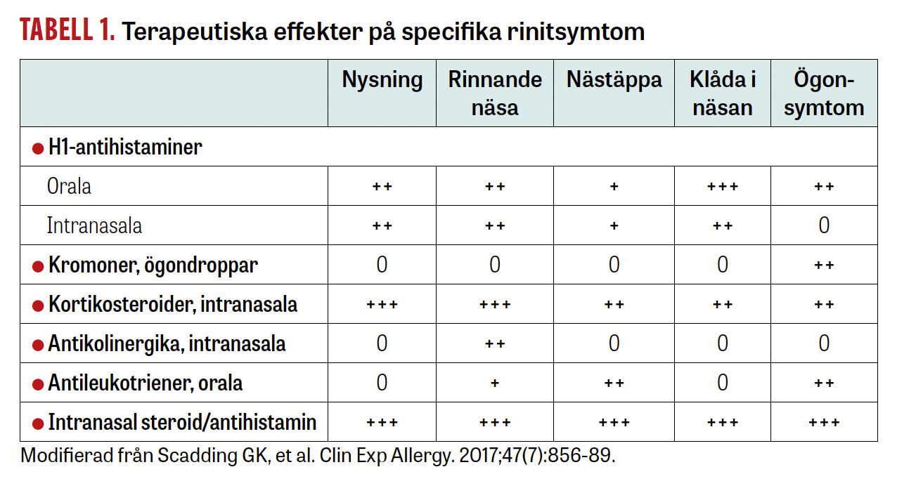 Effekten av olika farmakologiska terapier på olika symtom av allergisk rinit beskrivs i Tabell 1. Nästäppa är ett av de symtom som patienterna själva bedömer som besvärligast, och en vanlig anledning till nedsatt livskvalitet [14]. Logiskt nog blir därför intranasala steroider en viktig bas i behandlingen, då steroider är överlägsna andra terapier på just nästäppa [15]. Kortisonbehandling 2 ggr/dag bör initieras, men efter en tids symtomfrihet kan dosen reduceras till 1 per dag. Om patienten har andra uttalade besvär, som till exempel klåda eller ögonsymtom, kan antihistamin, oralt och/eller som ögondroppar, läggas till.
