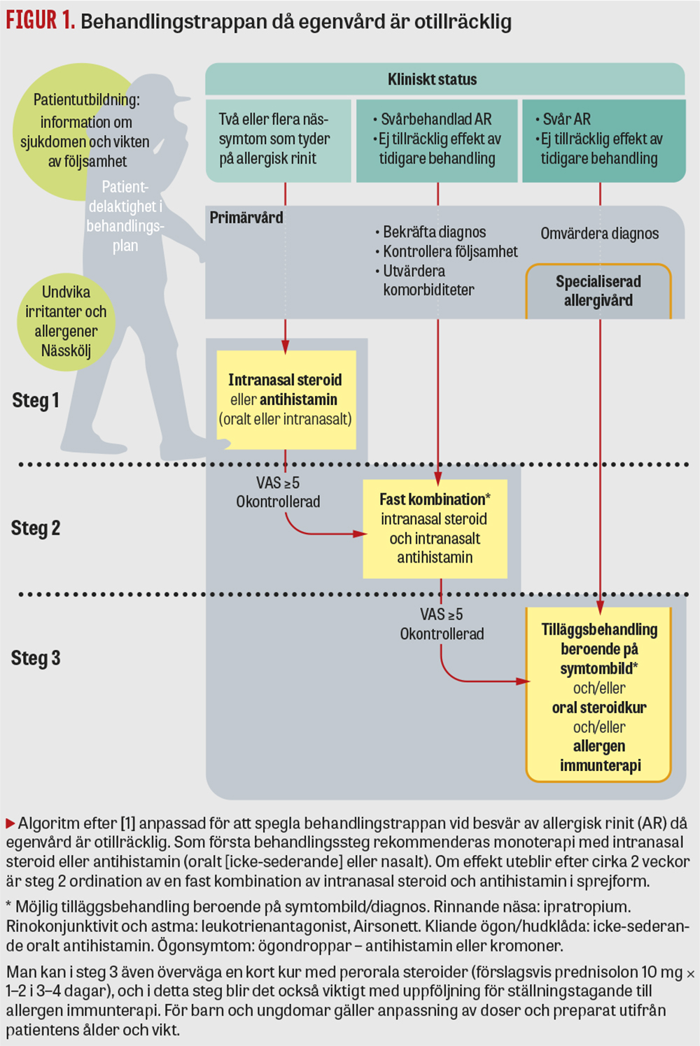 För ett par år sedan publicerade det europeiska samarbetsorganet EUFOREA (European Forum for Research and Education in Allergy and Airway Diseases) sin syn på hanteringen av allergisk rinit [1]. EUFOREA har i sina rekommendationer eftersträvat ett patientcentrerat synsätt och presenterar en relativt enkel behandlingsalgoritm (se Figur 1) för att på ett optimalt sätt ta till vara de behandlingsalternativ som finns att tillgå vid allergisk rinit. Intranasal kombinationsbehandling får här en tydligare roll.