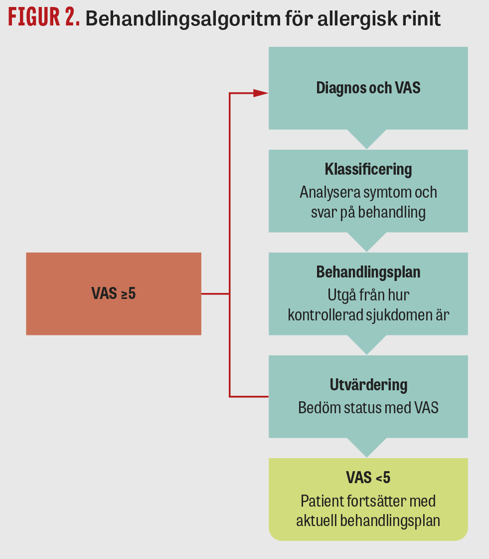 VAS är ett enkelt instrument som enligt vår bedömning borde få större plats inom utvärdering av allergisk rinit även i den svenska primärvården. Den kostnadsfria appen Mask-Air (https://www.mask-air.com/sv) är också ett välutvecklat uppföljningsverktyg, där patienten kan registrera sina dagliga besvär.
