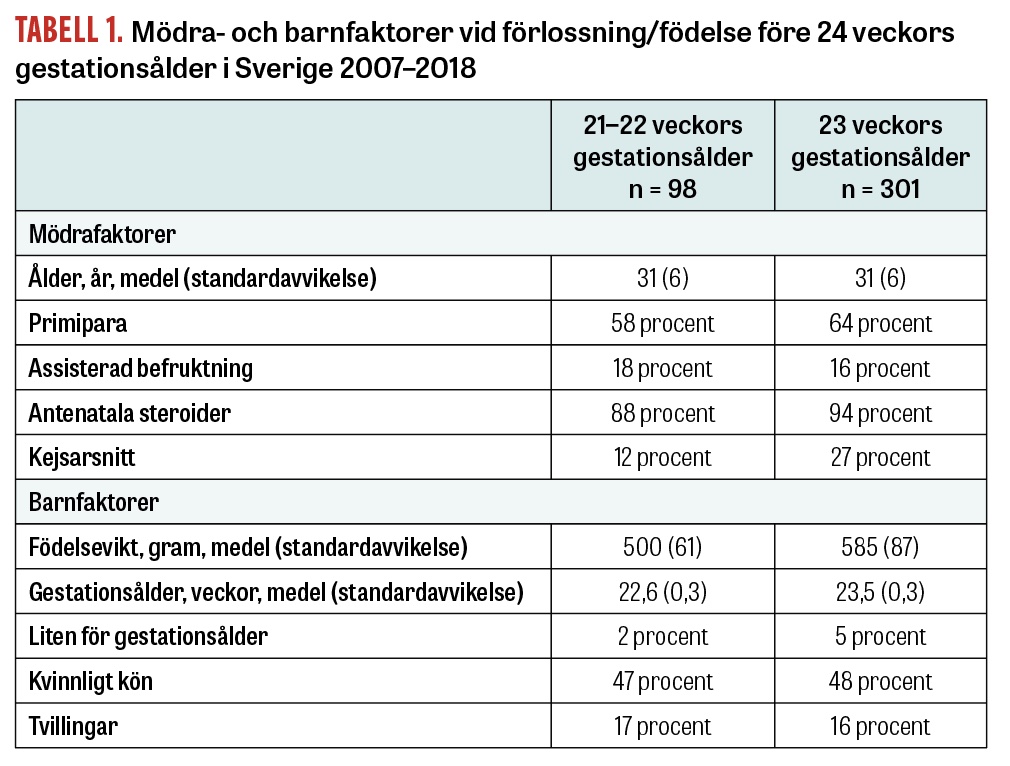 Totalt antal levande födda barn var 282 med gestationsålder 22 veckor (inkluderande 2 barn födda efter 21 veckor), varav 98 överlevde till utskrivningen, och 460 med gestationsålder 23 veckor, varav 301 överlevde till utskrivningen. Totalt 399 barn ingick i studien. Mödra- och barnfaktorer vid förlossning/födelse redovisas i Tabell 1.