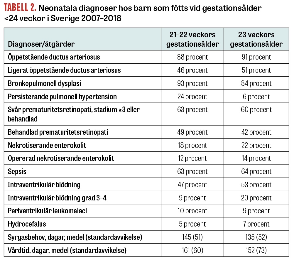 Det råder delade meningar om aktiv vård av barn med gestationsålder <24 veckor, och nationella rekommendationer varierar också mellan västeuropeiska länder. Vi fann att en hög andel av barnen hade utvecklingsneurologiska funktionsnedsättningar, och många har sannolikt behov av livslångt stöd. Detta visar på vikten av en multidisciplinär aktiv uppföljning av god kvalitet för tidig diagnos och att samhällsresurser avsätts för adekvat stöd till barn och familjer. Sedan 2015 finns nationella riktlinjer för uppföljning av neonatala riskbarn, där utvecklingsbedömningar och diagnoser rapporteras till Svenskt neonatalt kvalitetsregister. En ökad nationell följsamhet till dessa riktlinjer skulle möjliggöra uppföljning av såväl vård som behandlingsrekommendationer på nationell nivå.