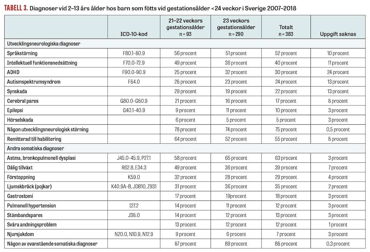 Totalt hade 96 procent av barnen en eller flera av de utvalda diagnoserna, vilket indikerar att dessa var relevanta för populationen. 88 procent hade en somatisk uppföljningsdiagnos vid något tillfälle, totalt 75 procent hade minst en utvecklingsneurologisk funktionsnedsättning och 55 procent hade remitterats för habilitering. Om språkstörning exkluderades hade 65 procent minst en och 50 procent två eller flera utvecklingsneurologiska funktionsstörningar. Den vanligaste utvecklingsneurologiska diagnosen var språkstörning (52 procent), och näst vanligast var intellektuell funktionsnedsättning (40 procent). Neuropsykiatriska diagnoser, såsom autism (24 procent) och ADHD (30 procent), var också vanligt förekommande. Bland barn födda vid gestationsålder 23 veckor hade pojkar oftare än flickor diagnosen intellektuell funktionsnedsättning (45 procent respektive 27 procent; P < 0,01) och synskada (25 procent respektive 14 procent; P < 0,05), och pojkar var oftare remitterade till habilitering (60 procent respektive 43 procent; P < 0,01) [6].