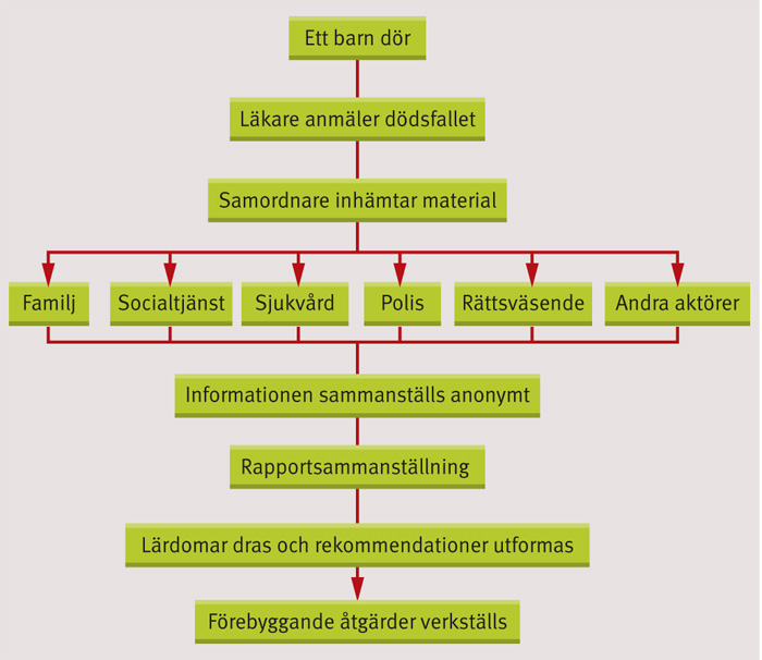 I England och Wales görs sedan 2008 multiprofessionella granskningar av alla dödsfall bland barn, oavsett orsak. Syftet är att hitta förebyggbara faktorer och att dra lärdomar för att bättre kunna skydda och främja barns hälsa och livsvillkor. En djupare granskning, serious case review, görs när det finns misstanke eller vetskap om misshandel eller omsorgssvikt i samband med ett dödsfall, eller när ett barn blivit allvarligt skadat till följd av misshandel eller omsorgssvikt men inte avlidit. Efter ett dödsfall inhämtas information från myndigheter och personer som varit i kontakt med barnet eller familjen i samband med dödsfallet. En multiprofessionell granskning görs sedan för att hitta förebyggbara faktorer och formulera rekommendationer för att förebygga dödsfallen (Figur 1) [6].