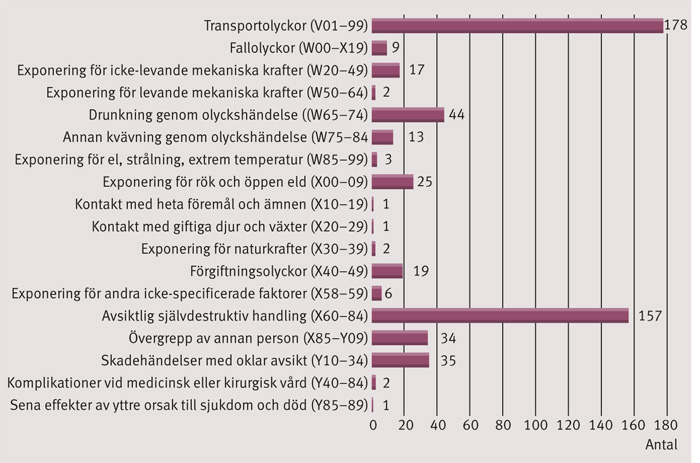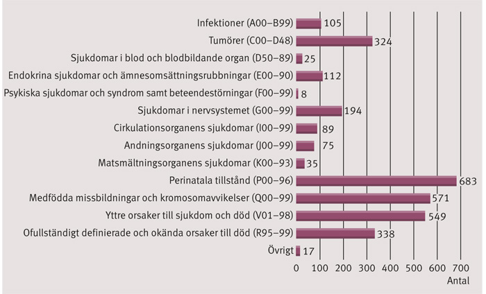 Under perioden 2006–2011 registrerades totalt 3 125 dödsfall bland barn (Figur 2). Av dessa skedde 549 till följd av yttre orsaker (V01–98), varav 34 var registrerade som övergrepp av annan person (X85–Y09) och 35 som skadehändelse med oklar avsikt (Y10–34). I denna grupp fanns även 159 barn vars död var registrerad som avsiktlig självdestruktiv handling (X60–84) (Figur 3). Därutöver var 338 dödsfall registrerade som ofullständigt definierade eller okända. Av dessa barn var 255 under 1 år vid dödsfallet.