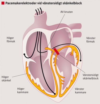 Vid vänstersidigt skänkelblock sker den elektriska aktiveringen av vänsterkammaren genom de distala grenarna i retledningssystemets högra skänkel (Figur 1). Den långsamma överledningen genom kammarseptum ger en fördröjning av aktiviteten med ytterligare 60-120 ms inom delar av vänsterkammaren [1, 2] och en kammarkontraktion som är asynkron – såväl interventrikulärt (mellan kamrarna) som intraventrikulärt (inom vänsterkammaren). Störningen får till följd kort fyllnadstid under diastole, försämrat koronarflöde och funktionellt betingad mitralinsufficiens. Resultatet blir minskad hjärtminutvolym och ogynnsamma sekundära neurohormonella konsekvenser.